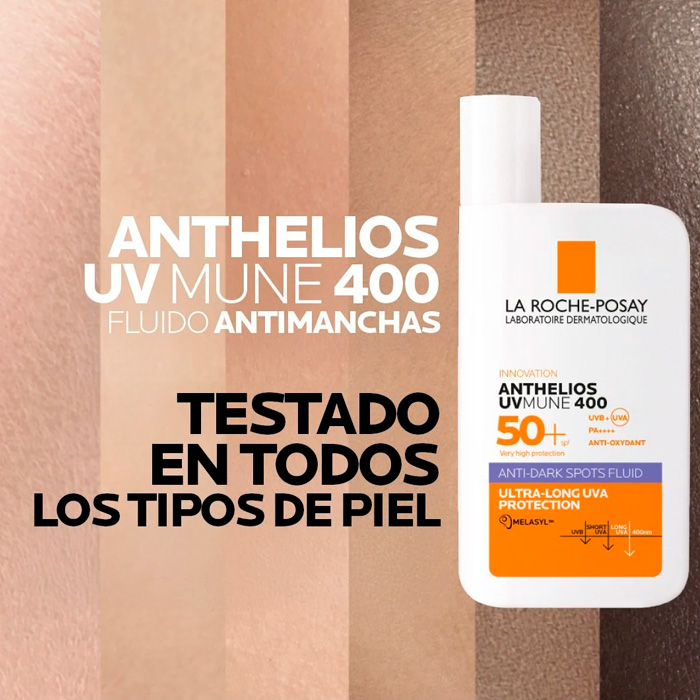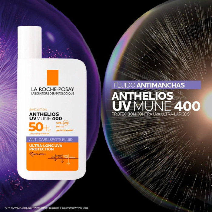Anthelios UVMune 400 Fluido Antimanchas SPF50+ es un protector solar facial diseñado para proteger de los rayos solares dañinos y combatir las manchas oscuras, dejando un cutis uniforme y luminoso.