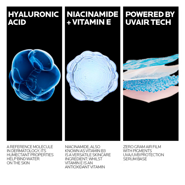 Gracias a la combinación de activos dermatológicos como el Ácido Hialurónico, la Niacinamida y la Vitamina E, este sérum no solo defiende contra la radiación UVA/UVB, sino que también cuida la barrera cutánea.