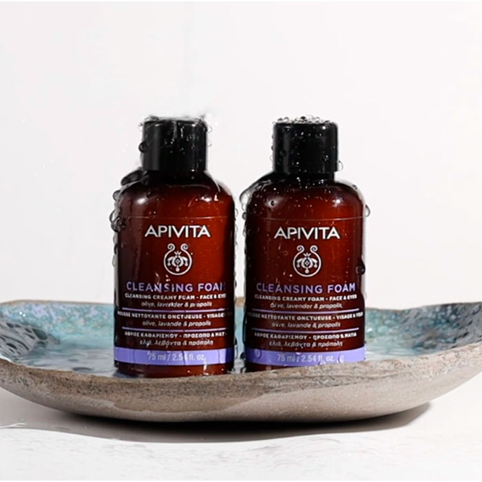 La Crema Espuma Limpiadora de Apivita es el compañero ideal para mantener una higiene facial impecable en cualquier lugar gracias a su práctico formato viaje de 75ml.