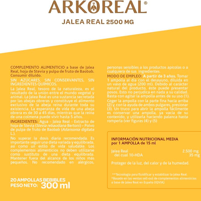 Máxima Potencia: Contiene 2500 mg de jalea real pura por ampolla, la dosis más alta para un rendimiento óptimo.