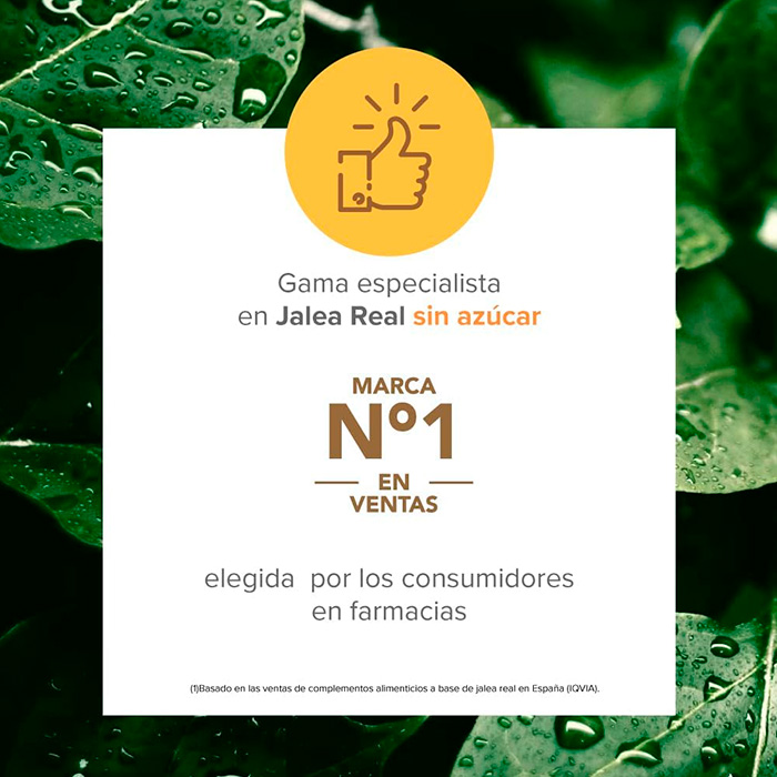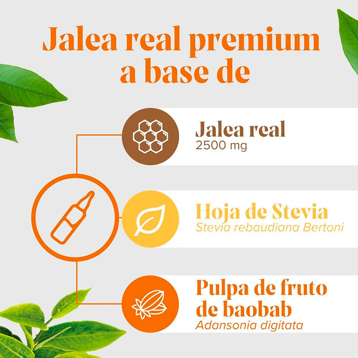 Su fórmula PREMIUM combina 2500 mg de jalea real con hoja de Stevia y pulpa de fruto de Baobab, ofreciendo un soporte energético natural con tan solo 3,8 Kcal por ampolla.