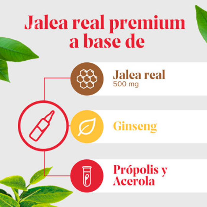 Agua – Jalea Real - Extracto de hoja de Stevia (Stevia rebaudiana Bertoni) - Extracto de raíz de Ginseng (Panax ginseng C.A- Mey) - Zumo concentrado de Naranja (Citrus sinensis (L.) Osbeck) - Zumo concentrado de baya de Acerola (Malpighia glabra L.). - Extracto de Própolis.