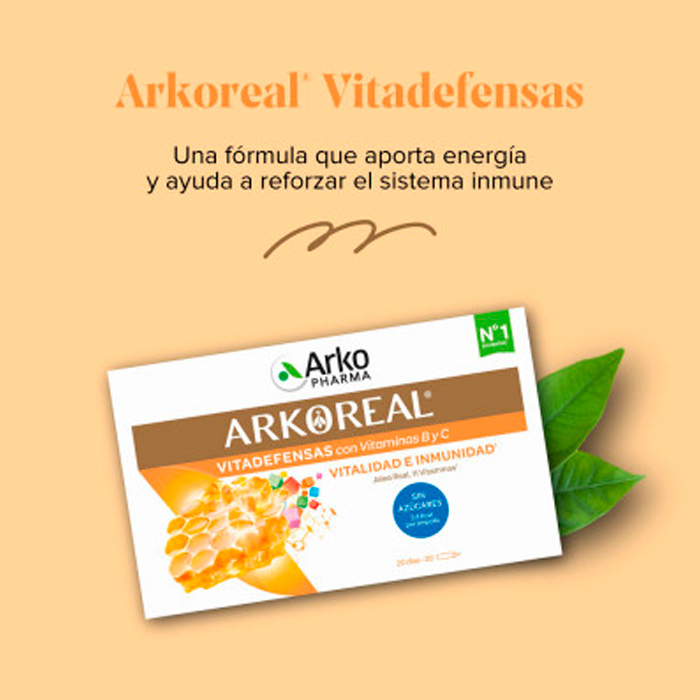 Arkopharma Arkoreal Vitadefensas es un complemento alimenticio sin azúcares, endulzado con edulcorante, que contiene jalea real y 11 vitaminas. Cada ampolla aporta solo 3.4 Kcal.