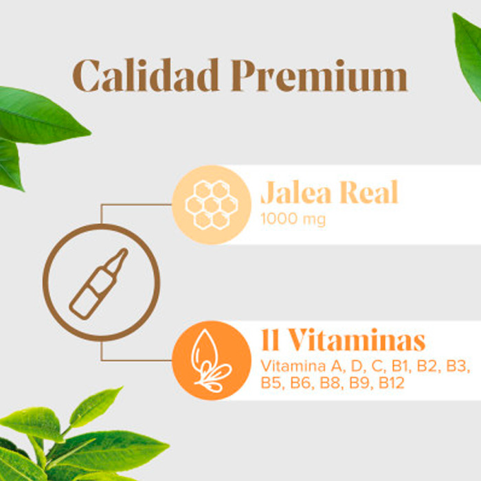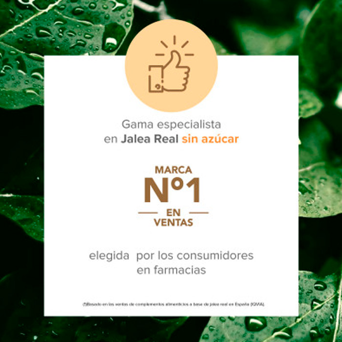 Agua - Jalea Real - Espesante: goma de acacia - Aroma natural de Naranja - Vitamina C (Ácido L-ascórbico) - Niacina - Acidulante: ácido cítrico - Vitamina A - Ácido Pantoténico - Edulcorante: glucósidos de esteviol procedente de la Stevia - Vitamina B12 - Vitamina D3 - Vitamina B2 - Vitamina B6 - Hidrocloruro de tiamina - Folato - D-Biotina. Sin gluten.