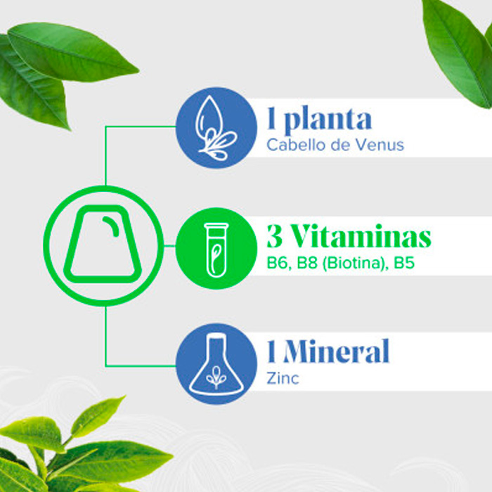 Jarabe de glucosa - Azúcar - Extracto de parte aérea de cabello de Venus (Adiantum capillus-veneris L.) - Acidificante: ácido cítrico, citrato de sodio - Gelificante: pectinas - Concentrado de flor de Cártamo (Carthamus tinctorius L.) y de rábano (Raphanus sativus L.) - Citrato de Zinc - Aroma natural - Vitamina B5 - Vitamina B6 - Vitamina B8 - Vitamina B9. Agente de recubrimiento: cera de carnauba.