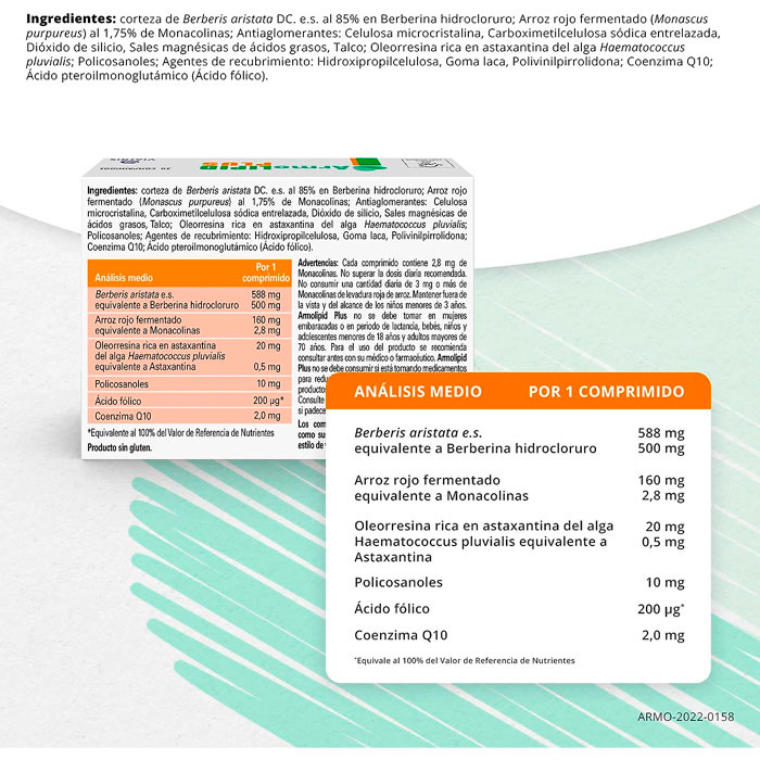 Un comprimido de Armolipid Plus contiene Berberis aristata e.s. 588 mg (equivalente a 500 mg de Berberina cloruro), Arroz rojo fermentado 200 mg (equivalente a 3 mg de Monacolina K), Policosanol 10 mg, Ácido fólico 0,2 mg, Coenzima Q10 2,0 mg y Astaxantina 0,5 mg.