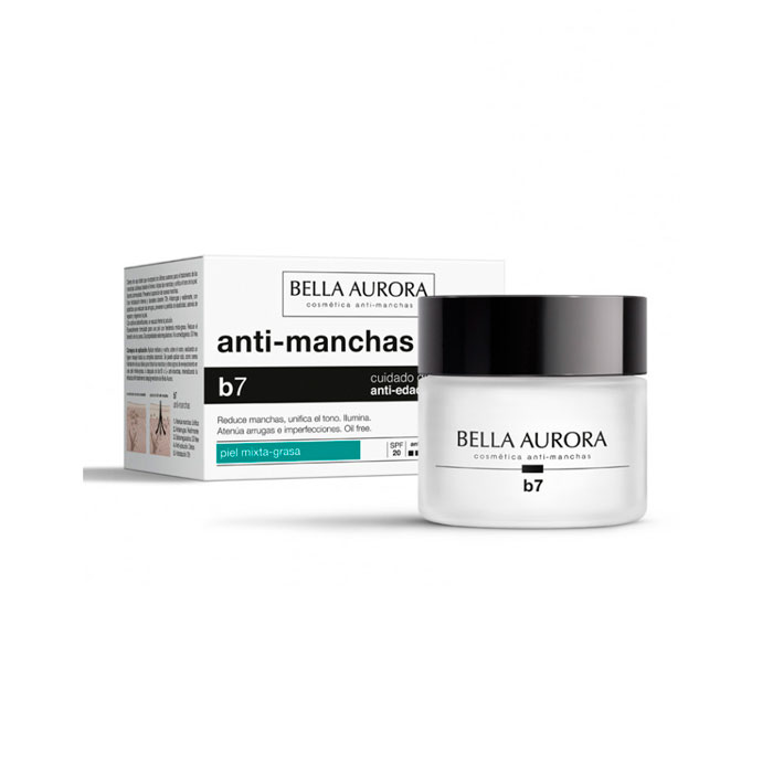 Bella Aurora B7 Antiedad Antimanchas Piel Mixta-grasa es una crema de uso diario para pieles normales con tendencia a grasa que despigmenta, aclara las manchas y unifica el tono de la piel, aportando luminosidad. Previene la aparición de nuevas manchas. Además, hidrata la piel en profundidad proporcionándole confort. Acción calmante y protectora contra las agresiones externas, disminuye la producción de grasa y reduce el tamaño del poro consiguiendo una piel mate y sin brillos. Actúa sobre los signos de envejecimiento reduciendo las arrugas y líneas de expresión, previene la pérdida de elasticidad, favoreciendo la regeneración celular. Con protección SPF20 UVA + UVB + IR.