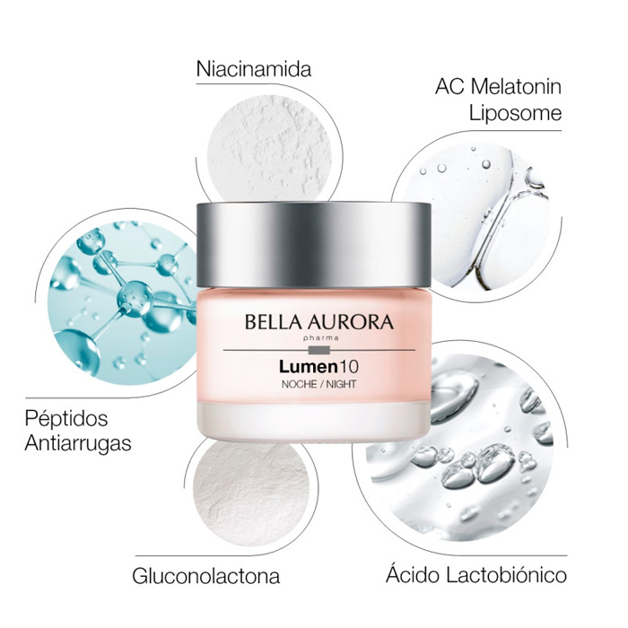 Descubre la transformación nocturna que tu piel necesita. Bella Aurora Lumen10 Crema Antiedad Antimanchas Noche, un tratamiento intensivo que trabaja mientras tú descansas, reparando los daños del día y revelando una piel más joven y radiante.
