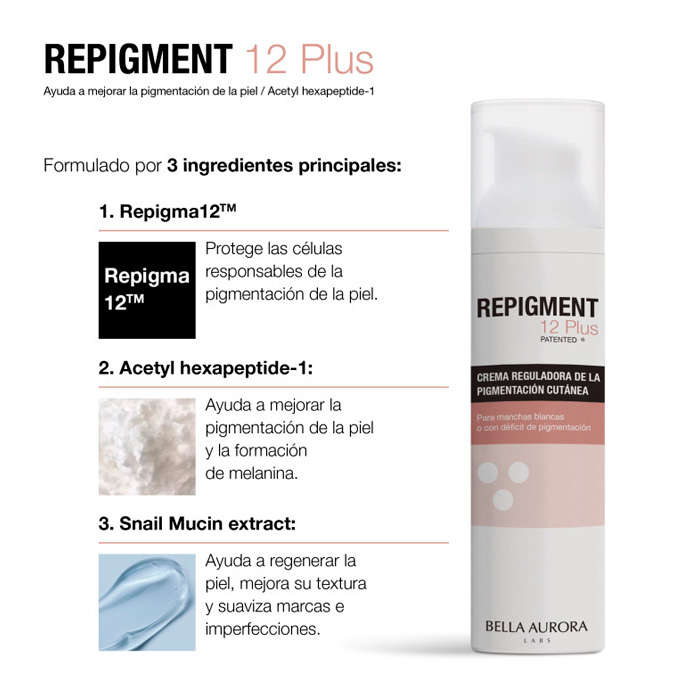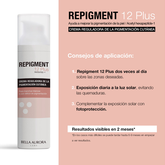 Bella Aurora Repigment12 Plus es una crema reguladora de la pigmentación cutánea, especialmente elaborada para manchas blancas o con déficit de pigmentación. Fórmula mejorada: resultados más rápidos.