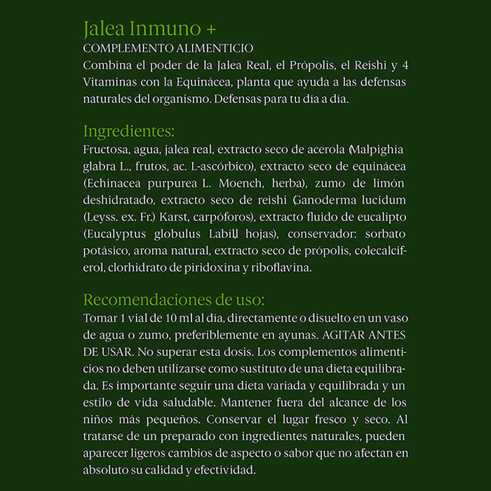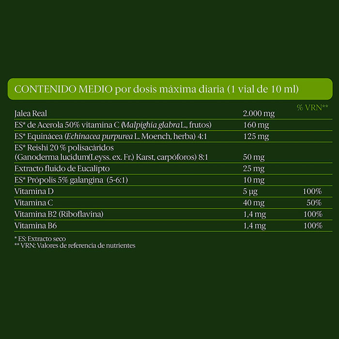 Indicado para fortalecer el sistema inmunitario. Contiene 2.000 mg de Jalea Real + Equinácea + Própolis + 4 Vitaminas. Contiene Reishi.
