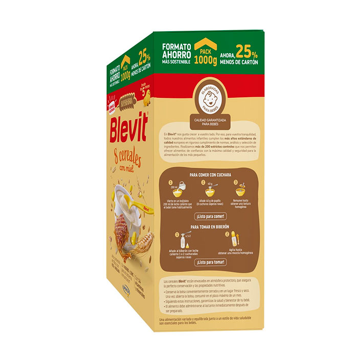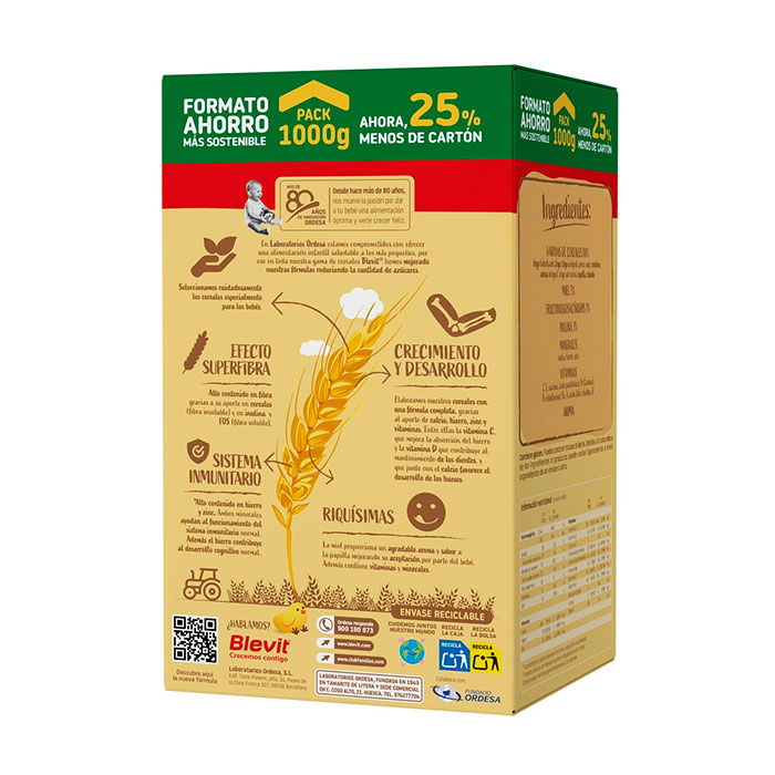 Blevit Superfibra 8 Cereales con Miel es una papilla equilibrada y completa, diseñada específicamente para ayudar a regular el tránsito intestinal del bebé gracias a su elevado aporte de fibra.