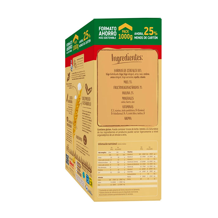 Harinas de cereales 88% (trigo hidrolizado, trigo, trigo integral, arroz, maíz, centeno, avena integral, trigo sarraceno, espelta, cebada), miel 5%, fructooligosacáridos 3%, inulina 3%, minerales (calcio, hierro, zinc), vitaminas (C, E, niacina, ácido pantoténico, B1 (tiamina), B2 (riboflavina), B6, A, ácido fólico, biotina, D), aroma.