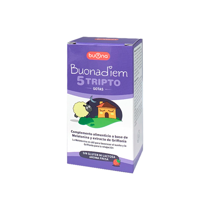BuonaDiem 5 Tripto es un complemento alimenticio de Melatonina y extracto de Griffonia, de forma líquida fácil de dosificar gracias al cuentagotas graduado.