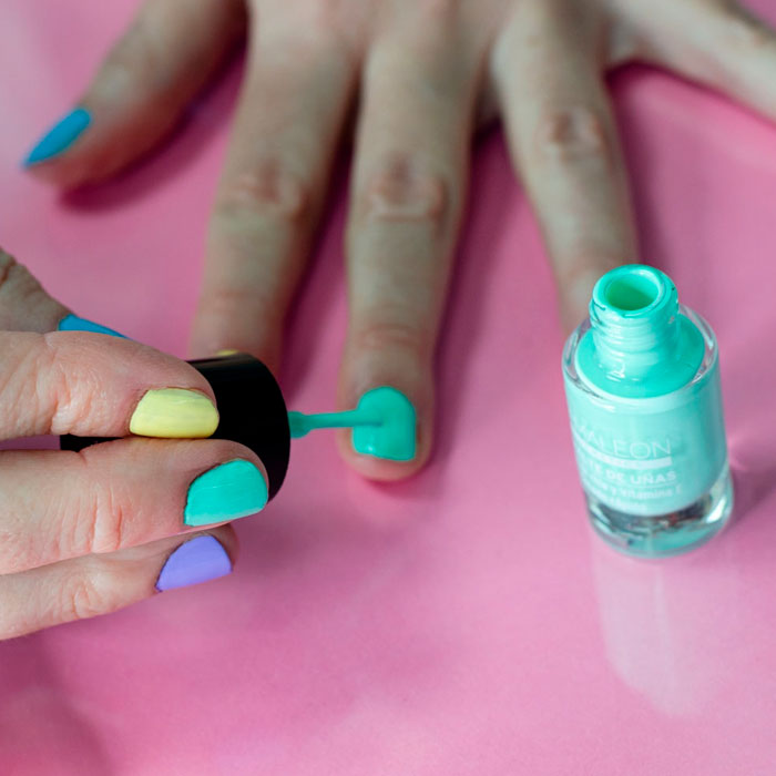 Aplicar Camaleon Esmalte de Uñas Verde Mint con ayuda del pincel, empezando en la base central de la uña y extendiendo el esmalte hasta la punta. Después aplicar el color en los laterales. Se puede aplicar una sola capa de esmalte sobre la uña si se opta por un acabado sutil, o aplicar dos capas si se quiere un tono más intenso.