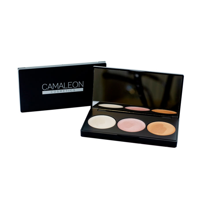 La Paleta 3 Iluminadores Camaleon es un iluminador en crema de efecto nacarado que aporta una luminosidad inmediata, realzando el rostro de manera natural. Está compuesto por un tono blanco, uno rosa y otro bronce.