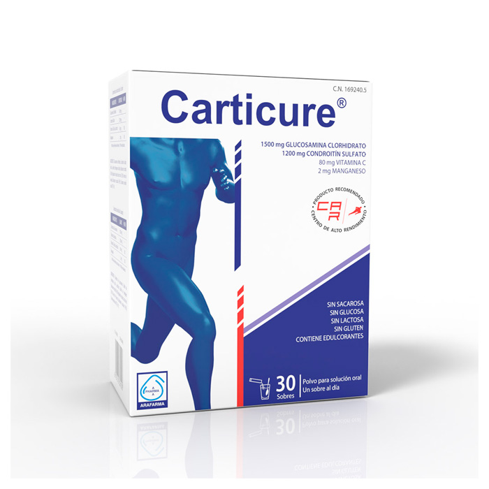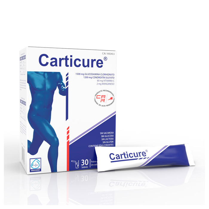 Carticure Sobres combina glucosamina y condroitín sulfato, componentes naturales del cartílago, que presentan un efecto sinérgico condroprotector.
