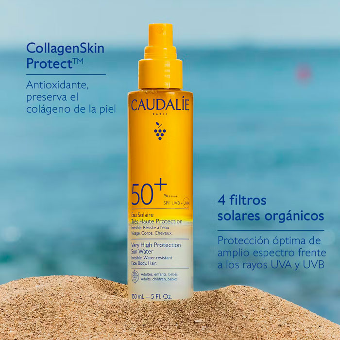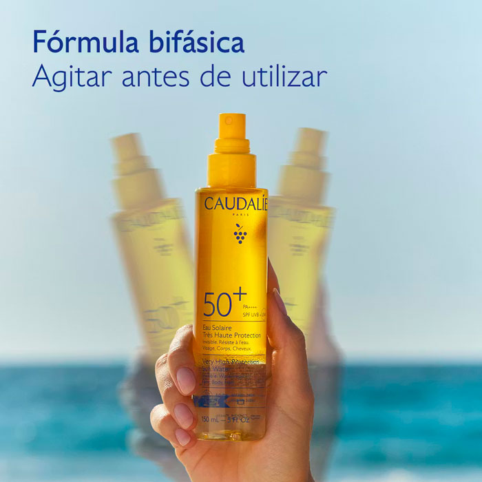 El Agua Solar de Muy Alta Protección SPF50+ de Caudalie Protección Solar redefine la fotoprotección con una innovadora textura bifásica, a medio camino entre el agua y el aceite.