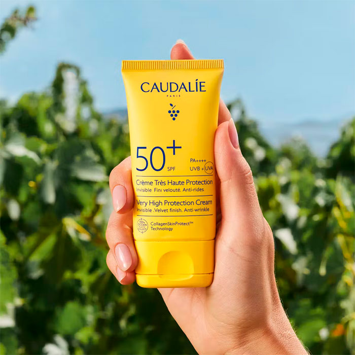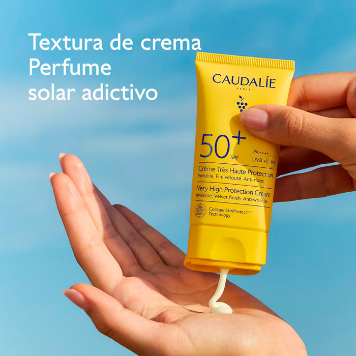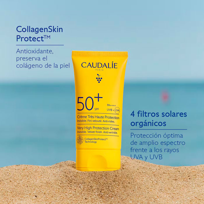 La Crema de Muy Alta Protección SPF50+ de Caudalie es un escudo solar avanzado diseñado para proteger eficazmente el rostro y el escote de los rayos UVA/UVB, proporcionando simultáneamente una potente acción antiarrugas.
