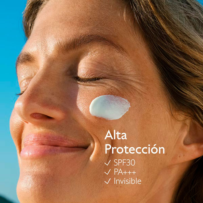 Su fórmula fluida de alta tolerancia protege contra los rayos UVA/UVB, mientras que la tecnología exclusiva CollagenSkinProtect™ actúa como un escudo contra la luz azul y los rayos infrarrojos.