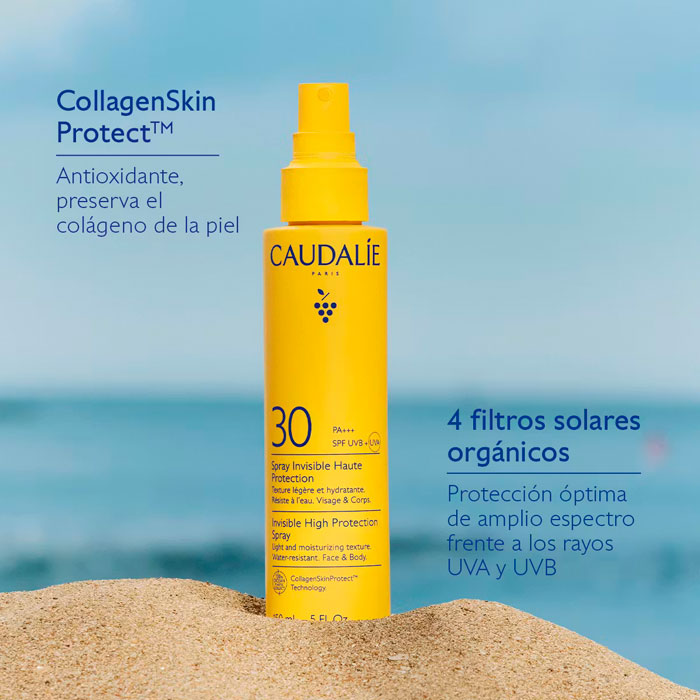 El Spray Invisible de Alta Protección SPF30 de Caudalie Protección Solar ofrece una defensa eficaz y sensorial para el rostro y el cuerpo.