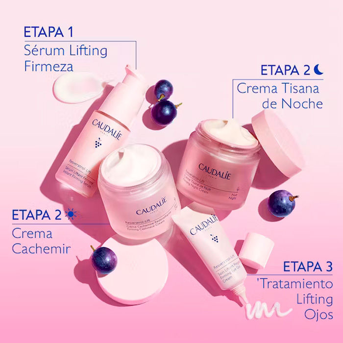 Aplicar Caudalie Resveratrol Lift Crema Tisana de Noche 50ml por la noche, rostro y cuello, sola o después del sérum.