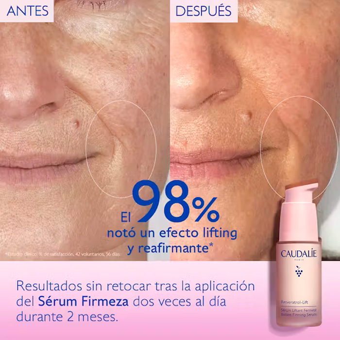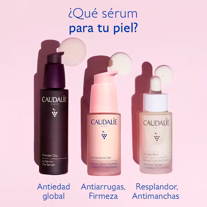 Aplicar Caudalie Resveratrol Lift Sérum Lifting Firmeza 30ml mañana y noche, sobre rostro, cuello y escote, antes de tu crema.