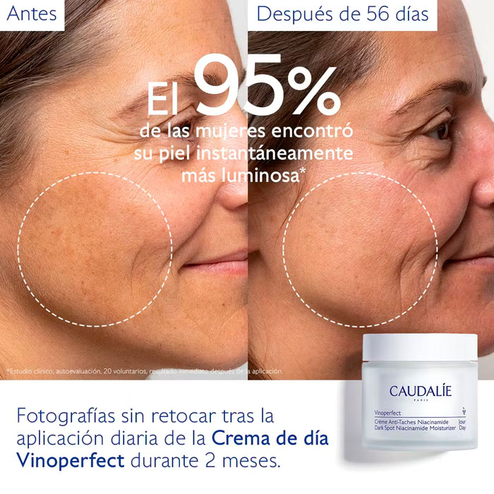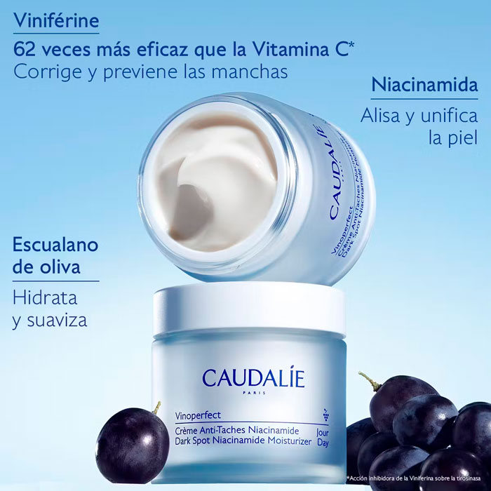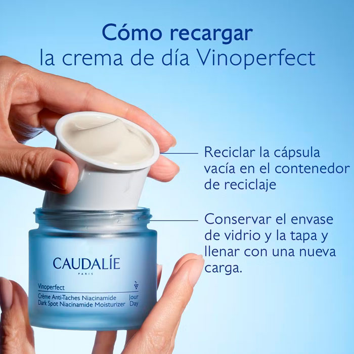 La Recarga Caudalie Vinoperfect Crema Antimanchas Niacinamida 50ml es un tratamiento facial completo y eco-responsable diseñado para prevenir y atenuar las manchas pigmentarias.