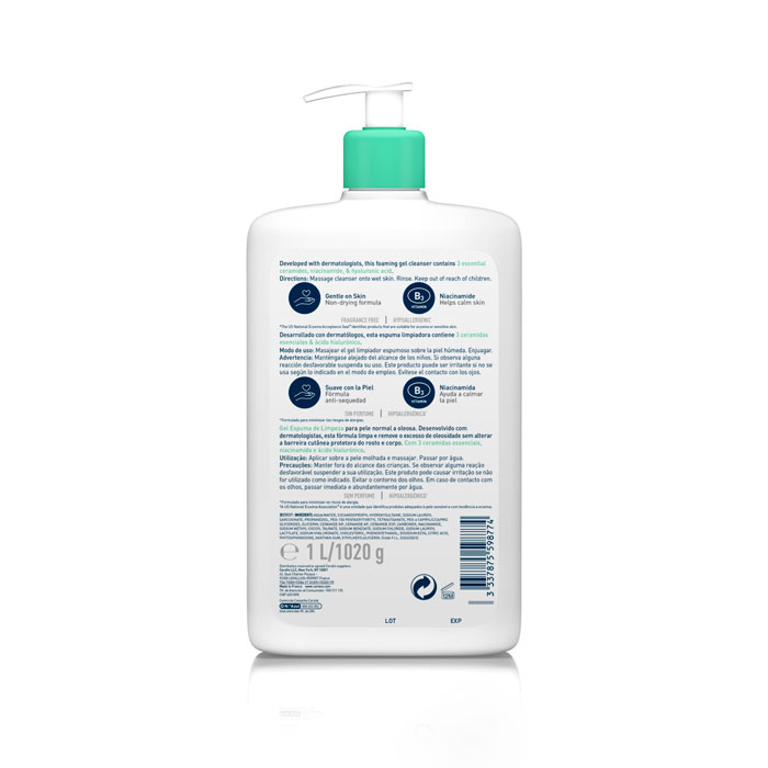 El Gel Limpiador espumoso de CeraVe crea espuma suave para limpiar profundamente el rostro y el cuerpo, sin alterar la barrera natural de la piel. Este gel refrescante, con 3 ceramidas esenciales y ácido hialurónico, elimina de forma eficiente el exceso de grasa, la suciedad y el maquillaje. Su fórmula sin perfume es adecuada para pieles sensibles.