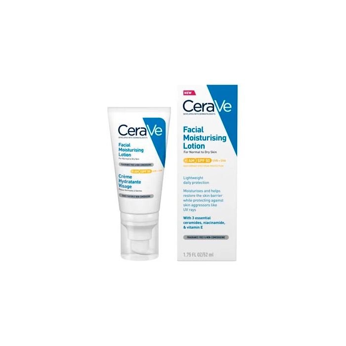 La Loción Hidratante de Rostro Spf50 Cerave ofrece una protección contra los rayos UVB/UVA y está formulada con 3 ceramidas esenciales, vitamina E y niacinamida, para dejar la piel calmada e hidratada hasta 24 horas, mientras repara la barrera natural de la piel. Es adecuada para la piel normal a seca y propensa al acné.