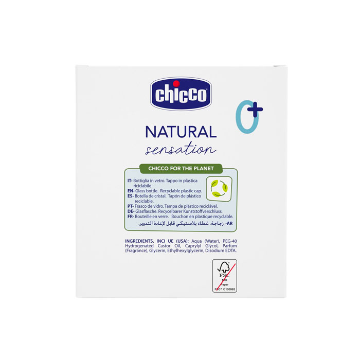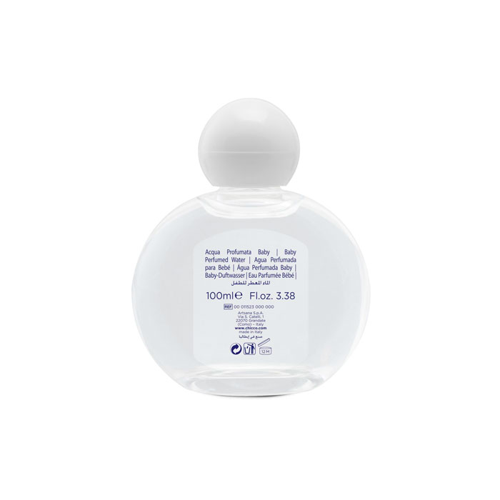 El Agua Perfumada Sin Alcohol Chicco Natural Sensation es una fragancia fresca y delicada en un envase de cristal, ideal para decorar la habitación del bebé por su diseño blanco y neutral.