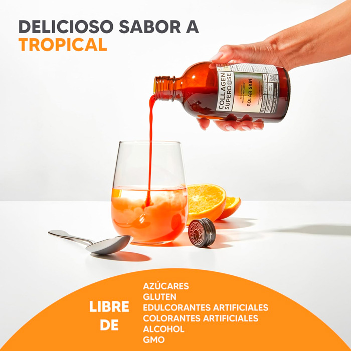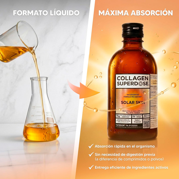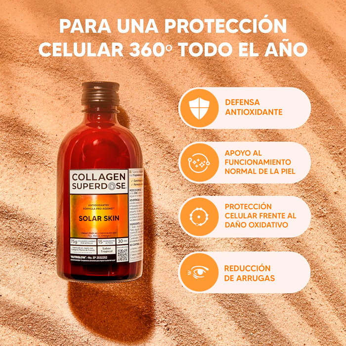 Collagen Superdose Solar Skin es un avanzado complemento alimenticio líquido de 300 ml diseñado para ofrecer una protección celular 360º desde el interior.