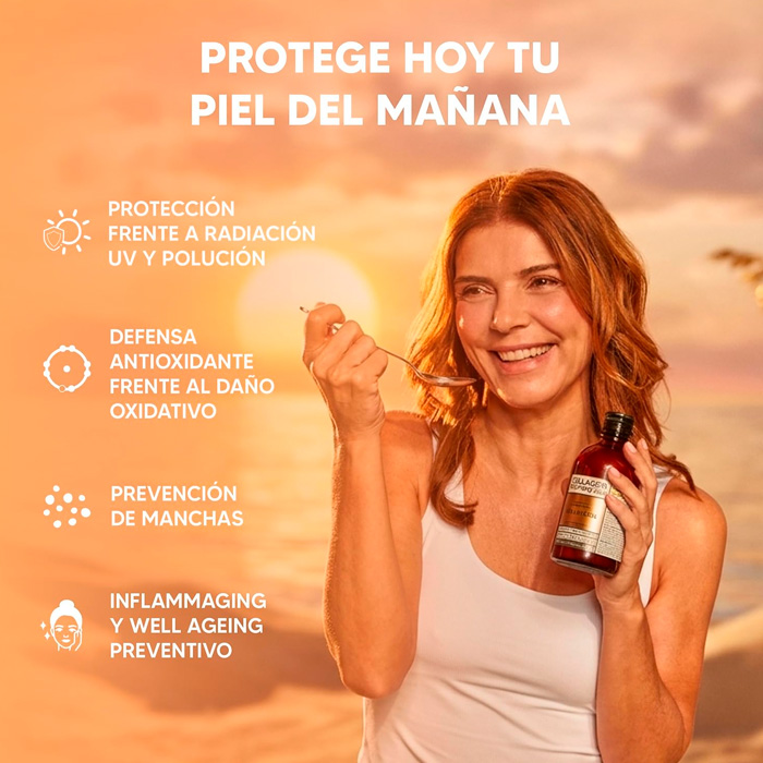 Su fórmula científica combina colágeno marino de alta calidad con una potente selección de carotenoides y antioxidantes que actúan como un escudo frente al daño oxidativo provocado por la radiación solar, la polución y el estrés urbano.