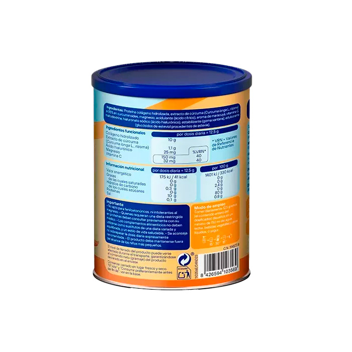 Proteína de colágeno hidrolizado 80 g, extracto de cúrcuma 8,9 g (Curcuma longa L., rizoma, 85% en curcuminoides), citrato de magnesio 7,7 g, ácido cítrico (regulador de acidez), aroma de maracuyá, maltodextrina, L-ascorbato de calcio (vitamina C) 372 mg, ácido hialurónico 225 mg, goma xantana (espesante), glucósidos de esteviol (edulcorante natural).