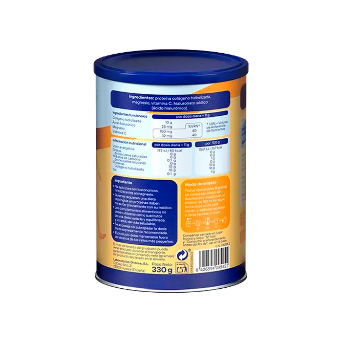 Proteína colágeno hidrolizada 91 g, citrato de Magnesio 8,7 g, L-ascorbato cálcico (vitamina C) 440 mg, ácido hialurónico 227 mg.