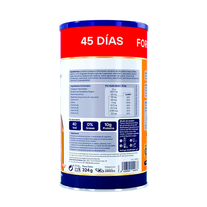 Proteína colágeno hidrolizada, extracto de Grosellero Negro (Ribes nigrum L. 4:1), magnesio (bisglicinato de magnesio), vitamina C (ascorbato cálcico), a?cido hialuro?nico (hialuronato so?dico), cobre (gluconato de cobre), vitamina B2 (riboflavina), vitamina B6 (clorhidrato de piridoxina), vitamina B1 (clorhidrato de tiamina), vitamina D3 (colecalciferol).