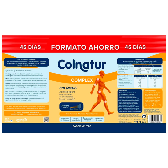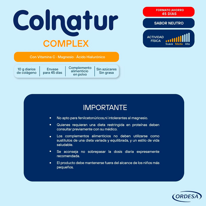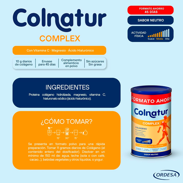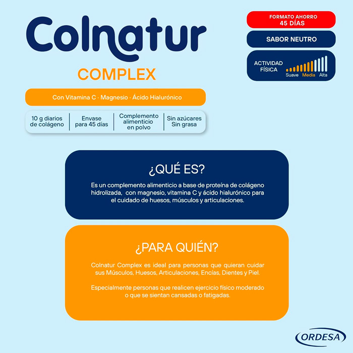 Colnatur Complex Neutro es un complemento alimenticio indicado para el cuidado de articulaciones, huesos, músculos, encías, dientes y piel, y ayuda a disminuir el cansancio y la fatiga.