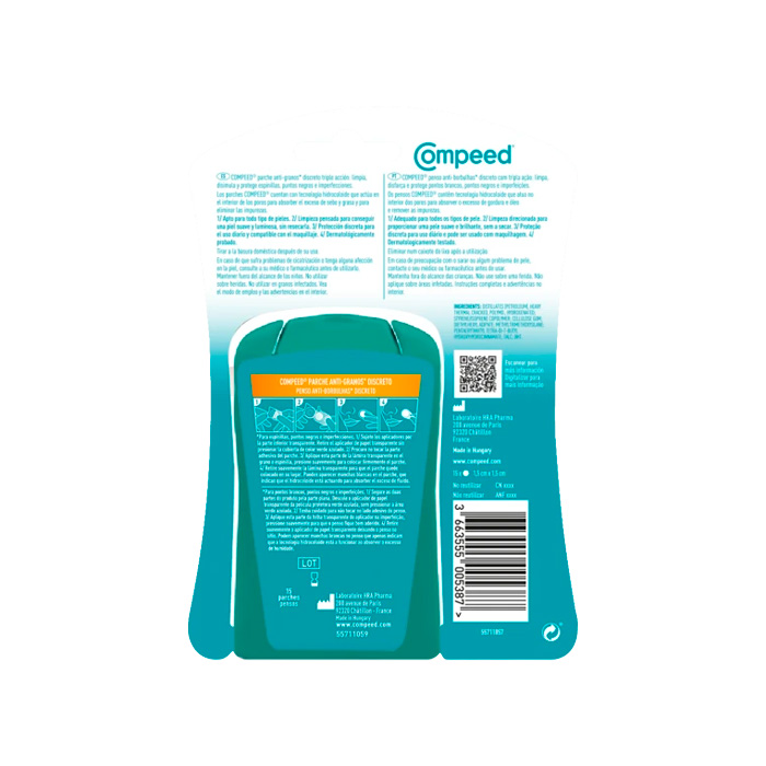 Los Parches Antigranos Discretos de Compeed son una solución efectiva para limpiar, disimular y proteger tus *imperfecciones cutáneas, como granos, espinillas y puntos negros.