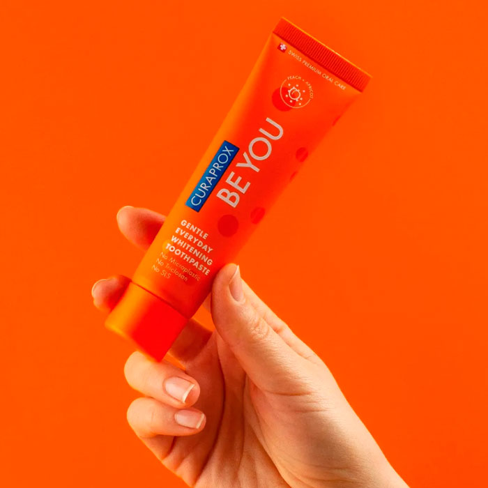 Curaprox Pasta Dental Be You Melocotón te ofrece un blanqueamiento dental suave que respeta tu esmalte, mientras te envuelve en un atrevido y dulce sabor a melocotón, diseñado para aumentar tu confianza con cada sonrisa.