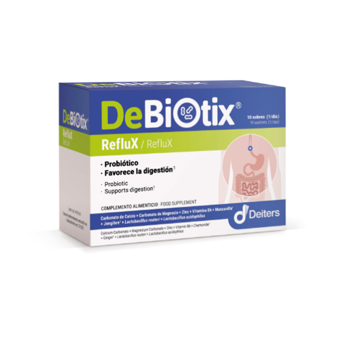 DeBiotix Reflux es un complemento alimenticio diseñado para aliviar los síntomas de la acidez estomacal y el reflujo gastroesofágico.