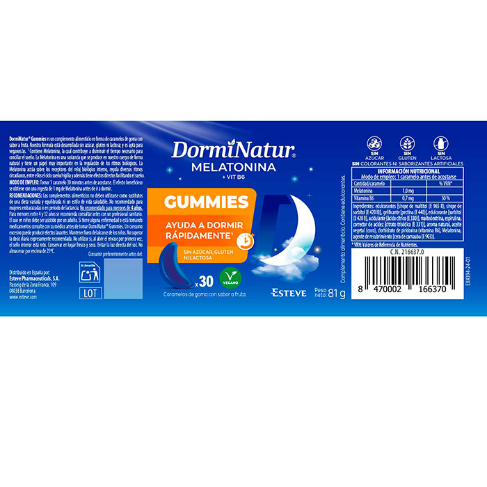 Dorminatur Melatonina 90Gummies es un complemento alimenticio diseñado para ayudarte a conciliar el sueño de forma natural y disfrutar de un descanso reparador.