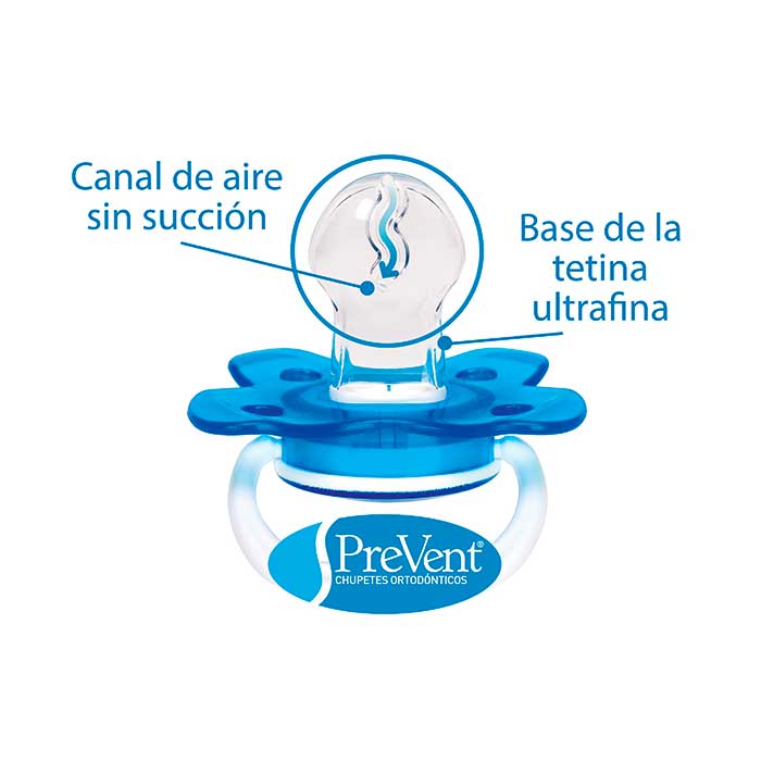 Chupete ortodóntico Prevent que facilita el correcto desarrollo de la cavidad oral, con un diseño en forma de mariposa más cómodo para el bebé ya que deja respirar la piel alrededor de su boca.