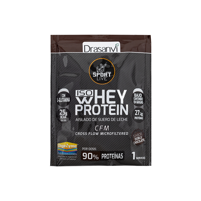 Drasanvi Sport Live Whey Protein Aislado Sabor Doble Chocolate es un complemento alimenticio a base de proteína de suero de leche aislada obtenida por microfiltración y ultrafiltrado.