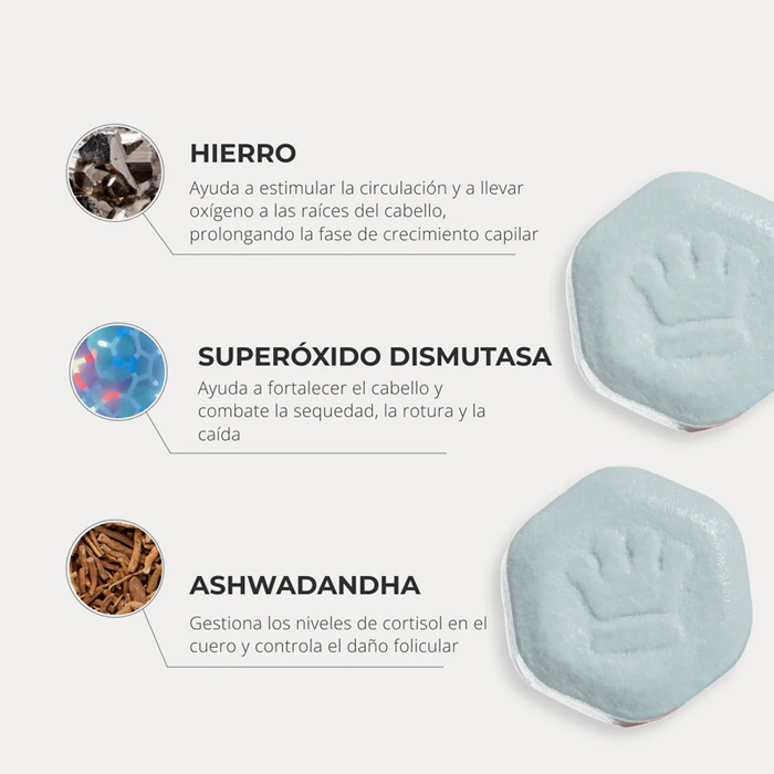 Superóxido dismutasa, Ashwagandha, Daidzeína, Genisteína, Vitamina D, Biotina, Zinc, Hierro, Magnesio.