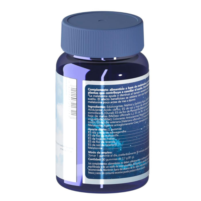 Por 1 gummie: 27 mg ES raiz y hoja de ashwagandha, 20 g ES de flor de manzanilla, 27 mg ES de hoja de melisa, 27 mg ES de flor de lavanda, 7 mg ES de raíz de valeriana y 1 mg melatonina