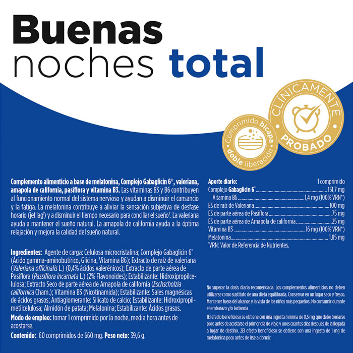Por 1 comprimido: Complejo Gabaglicin 6® (151,7 mg), Vitamina B6 1,4 mg (100% VRN*); ES de raíz de Valeriana (100 mg); ES de parte aérea de Pasiflora (75 mg); ES de parte aérea de Amapola de california (25 mg); Vitamina B3 (16 mg (100% VRN*), Melatonina (1,85 mg).