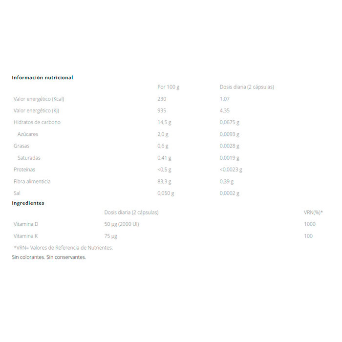 Agente de carga (celulosa microcristalina), agente de recubrimiento de la cápsula vegetal (pululano), vitamina K2 (menaquinona-7), vitamina D3 (colecalciferol). SIN azúcar, gluten, lactosa