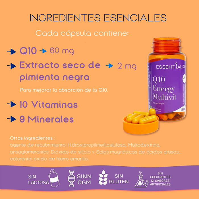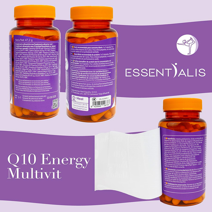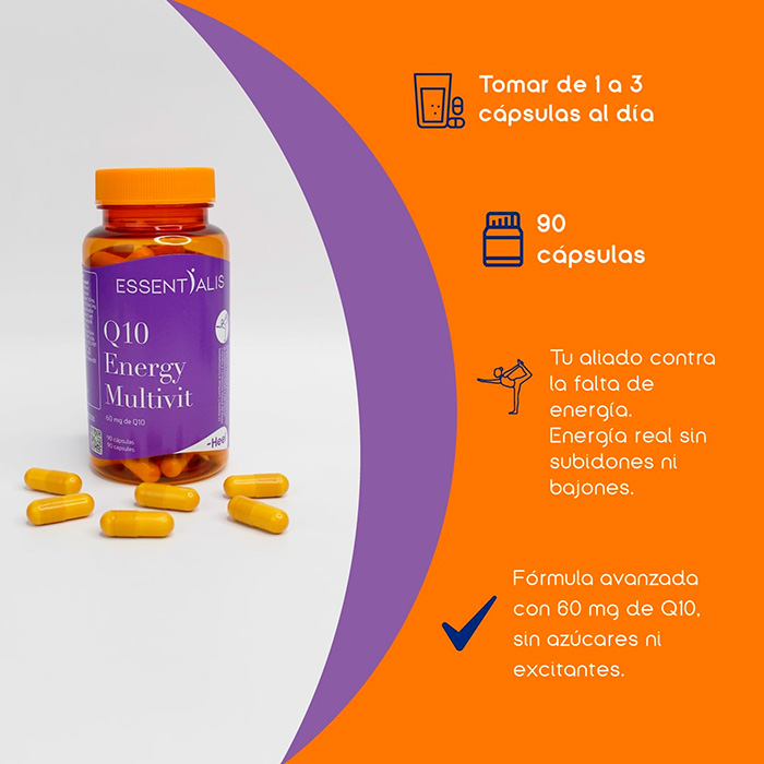 Essentialis Q10 Energy Multivit es una fórmula completa diseñada para aportar energía sostenida, mejorar la concentración, reforzar el sistema inmune y reducir el cansancio.