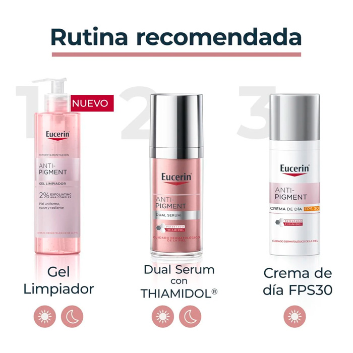 Aplica Eucerin Anti-pigment Crema Día Spf30 50 ml por la mañana en el rostro, en el cuello y en el escote una vez realizada la limpieza. Masajea suavemente sobre la piel. Evita el contacto directo con los ojos. Aplica una vez al día por la mañana. Usa un máximo de cuatro aplicaciones de productos que contengan Thiamidol® al día en el rostro