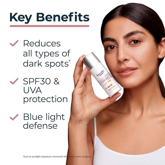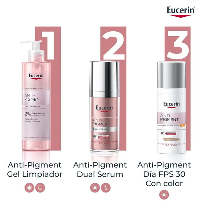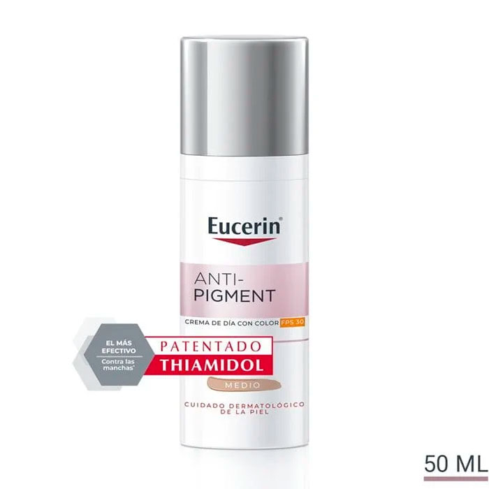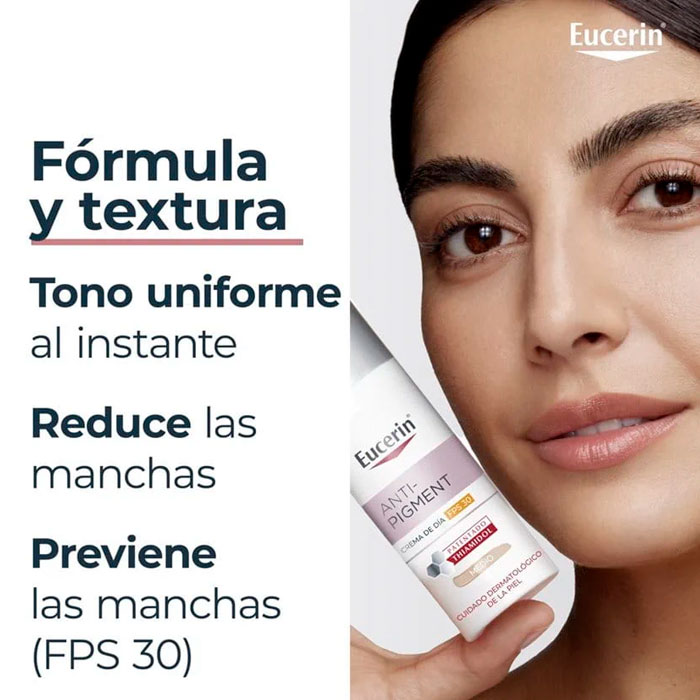Eucerin Anti-Pigment Crema de Día SPF30 Tono Medio es una crema hidratante diaria que no solo unifica el tono de tu piel al instante, sino que también ofrece una avanzada protección y un tratamiento eficaz contra las manchas.