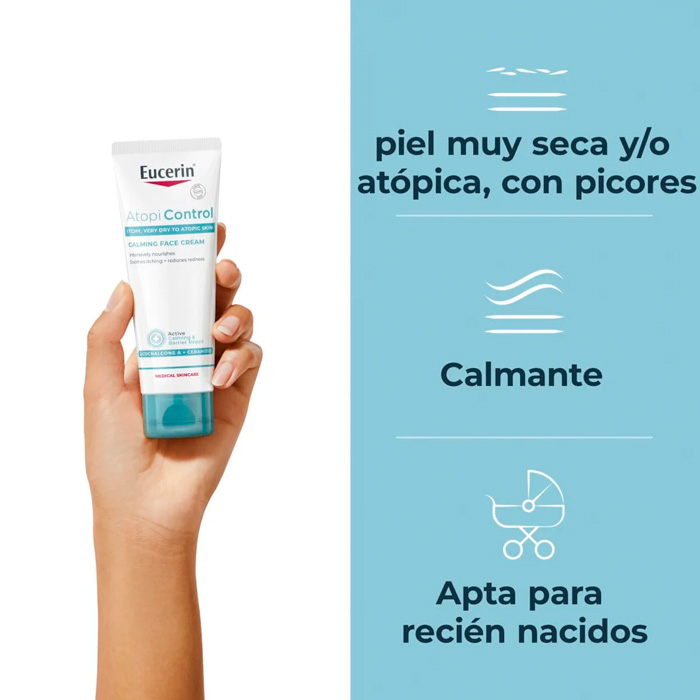La Crema Facial Eucerin AtopiControl está especialmente formulada para el cuidado diario de la piel atópica, especialmente durante las fases en las que los síntomas están controlados.
